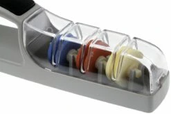 Avec le Vulkanus Professional Generation 2 les performances de cet aiguiseur éprouvé ont encore été optimisées. Par exemple, le matériau et la forme de la partie qui aiguise ont été améliorés et l’angle d’aiguisage a été élargi de 11° à 21°. En outre, les éléments aiguisant sont désormais faciles à changer si nécessaire. Les ressorts ont également été modifiés, ils sont désormais dissimulés et leur force de pression a considérablement augmenté. Le Vulkanus Professional Generation 2 excelle avant tout par sa rapidité et sa simplicité. Il suffit de passer la lame du couteau plusieurs fois dans la fente pour obtenir un tranchant aiguisé.